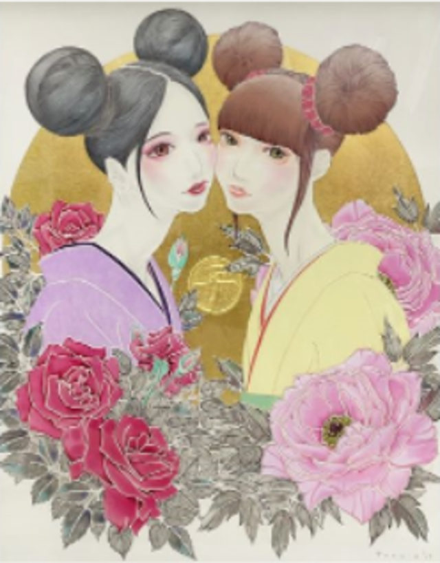 アーティスト:大槻透 タイトル:子年 牡丹と薔薇 技法:パネルに添付したテンペラ サイズ:62×55cm
